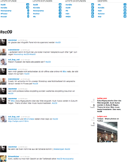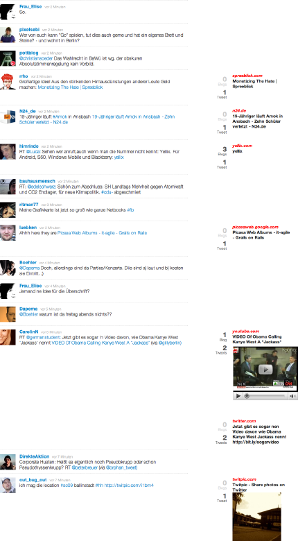 An weiteren Filtern habe ich fertig: meist-verlinkte URLs, Videos, Fotos, häufigste Retweets, gefavte Tweets, aktuelle Hashtags und Tweets dazu. Natürlich immer am eigenen sozialen Graphen aufgehängt: