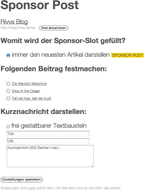– Auf Wunsch hab ich die Sponsor Posts ein wenig aufgebohrt, so dass Sponsor Slots jetzt drei Optionen bieten: (i) immer den neuesten Artikel aus einem Feed ziehen, (ii) einen bestimmten Beitrag für längere Zeit stehen lassen oder (iii) eine vom Feed unabhängige Kurznachricht absetzen.